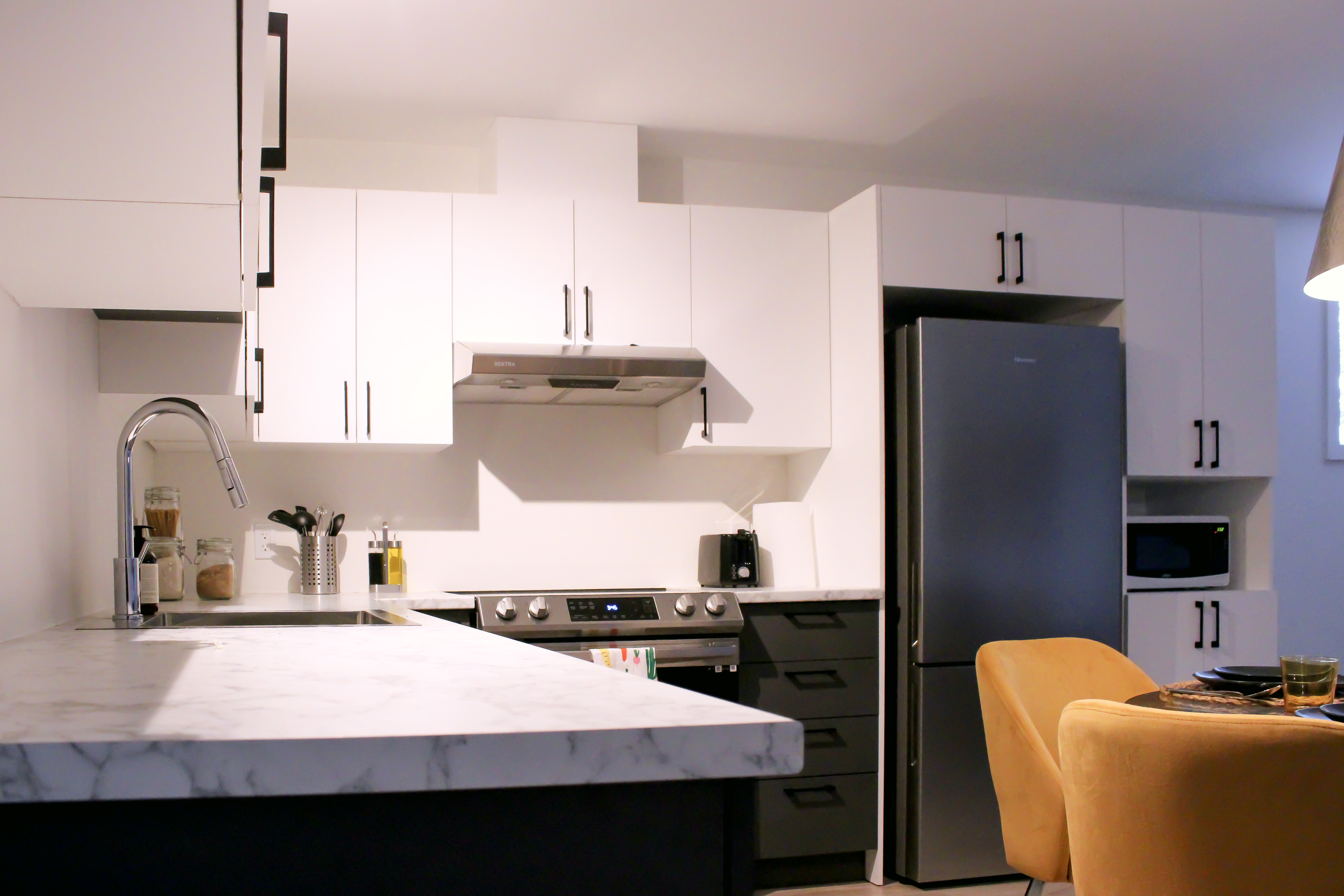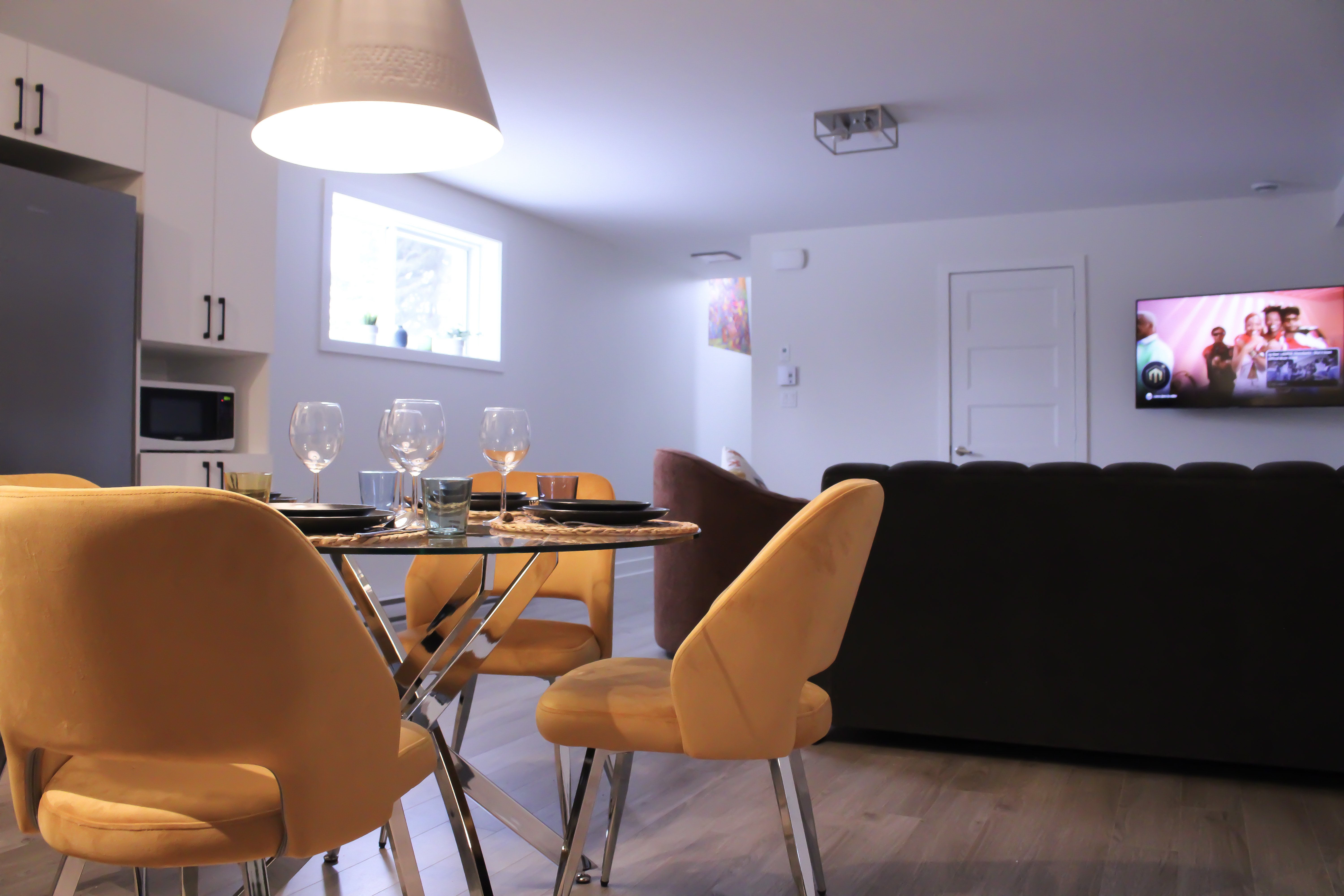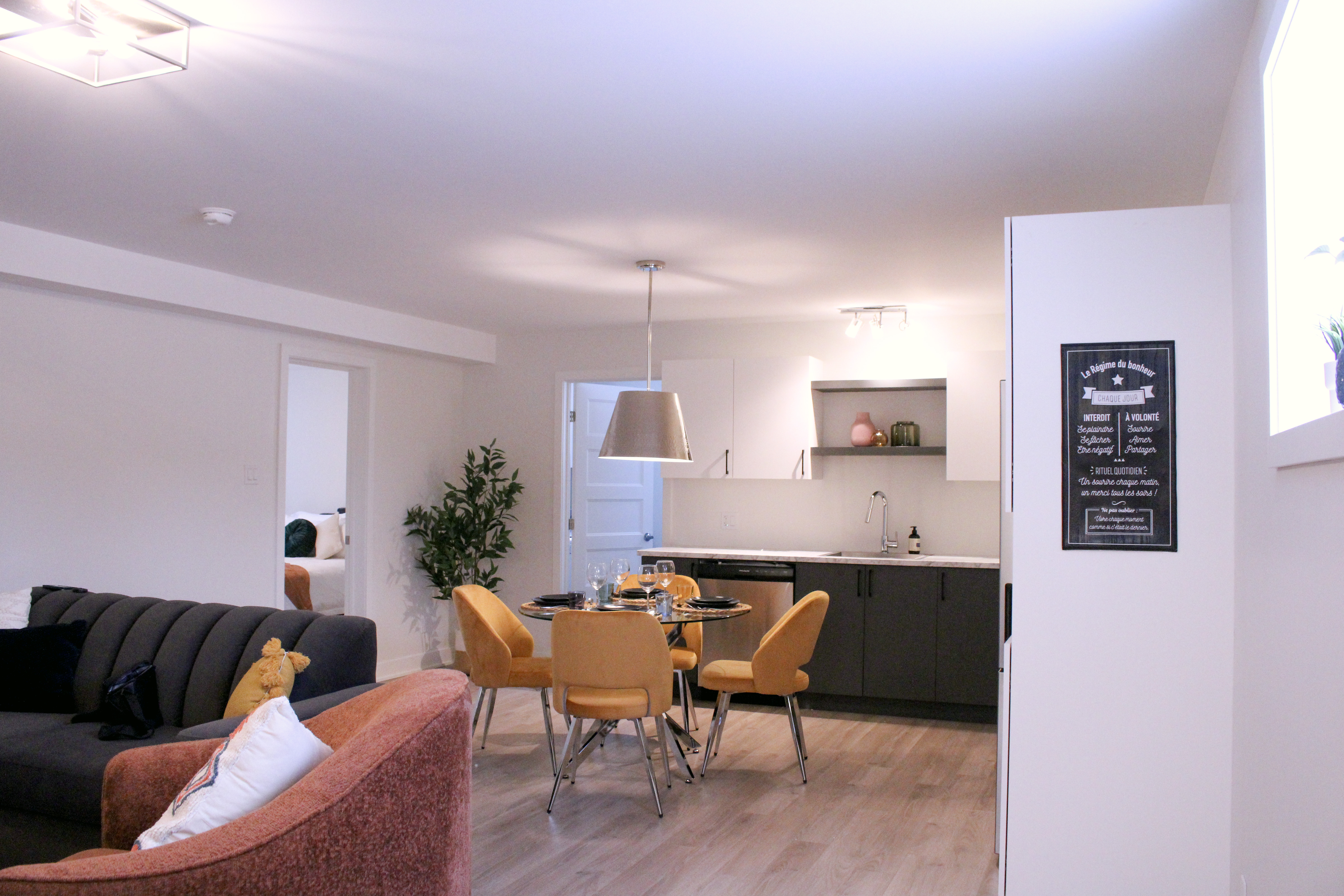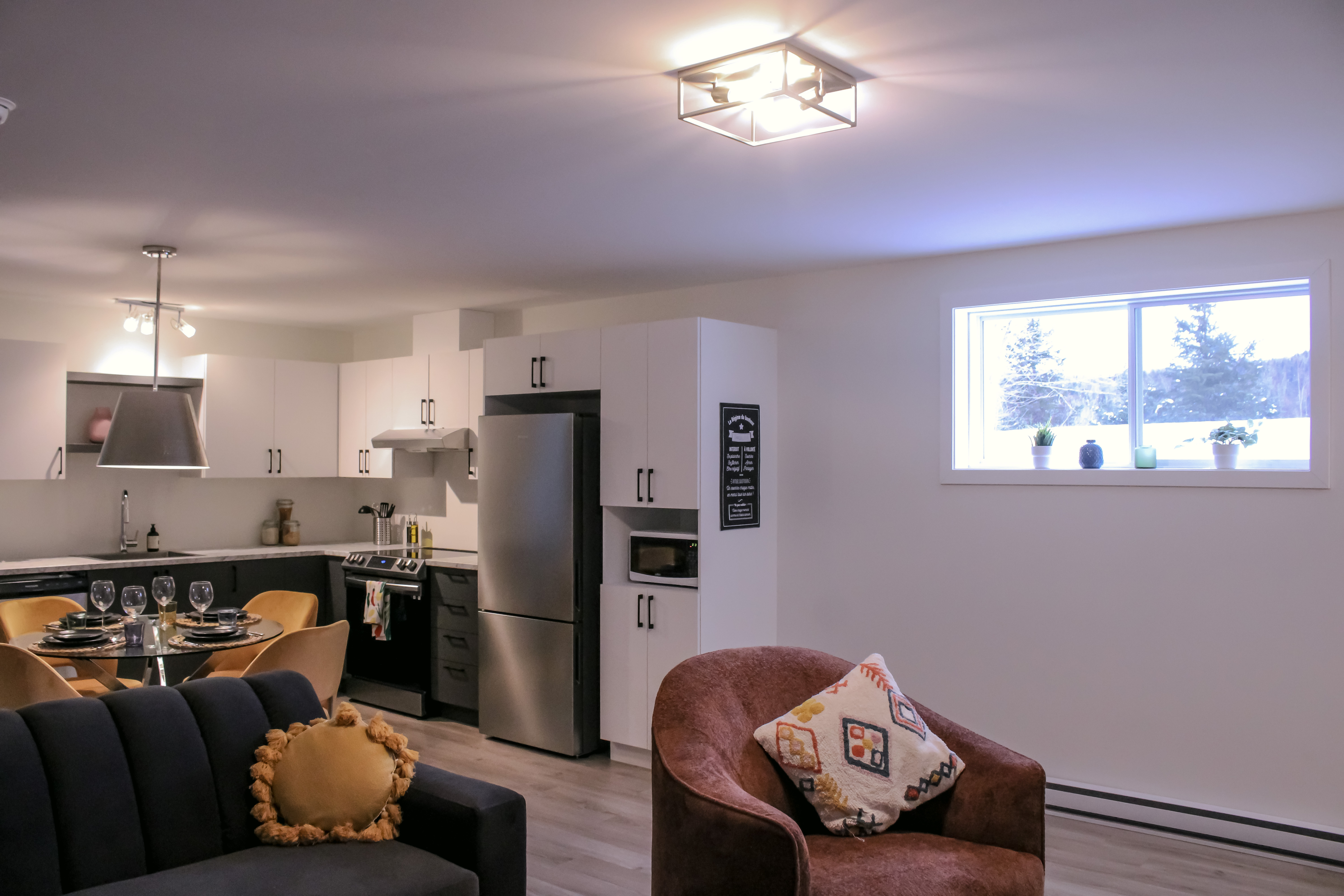 - Ambiance chaleureuse: Notre appartement dispose d’une chambre confortable avec un lit queen, d’un salon accueillant comprenant également un divan-lit queen avec matelas à mousse mémoire de qualité pour un sommeil réparateur, et d’une cuisine à aire ouverte entièrement équipée. Vous trouverez également une laveuse et une sécheuse pour votre confort.